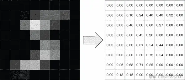图 4.1. 在深度学习中使用张量表示一个 MNIST 图像。为了可视化,我们将 MNIST 图像从 28 × 28 缩小到 8 × 8。这张图片是一个灰度图像,它的高度-宽度-通道(HWC)形状为[8, 8, 1]。这个图示中省略了最后一维的单个颜色通道。