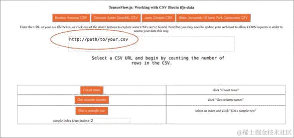 tf.data.Dataset对象:从 JavaScript 数组、从 CSV 文件,或者从数据生成函数。从远程 CSV 文件流式传输数据集可以在一行 JavaScript 代码中完成。 -