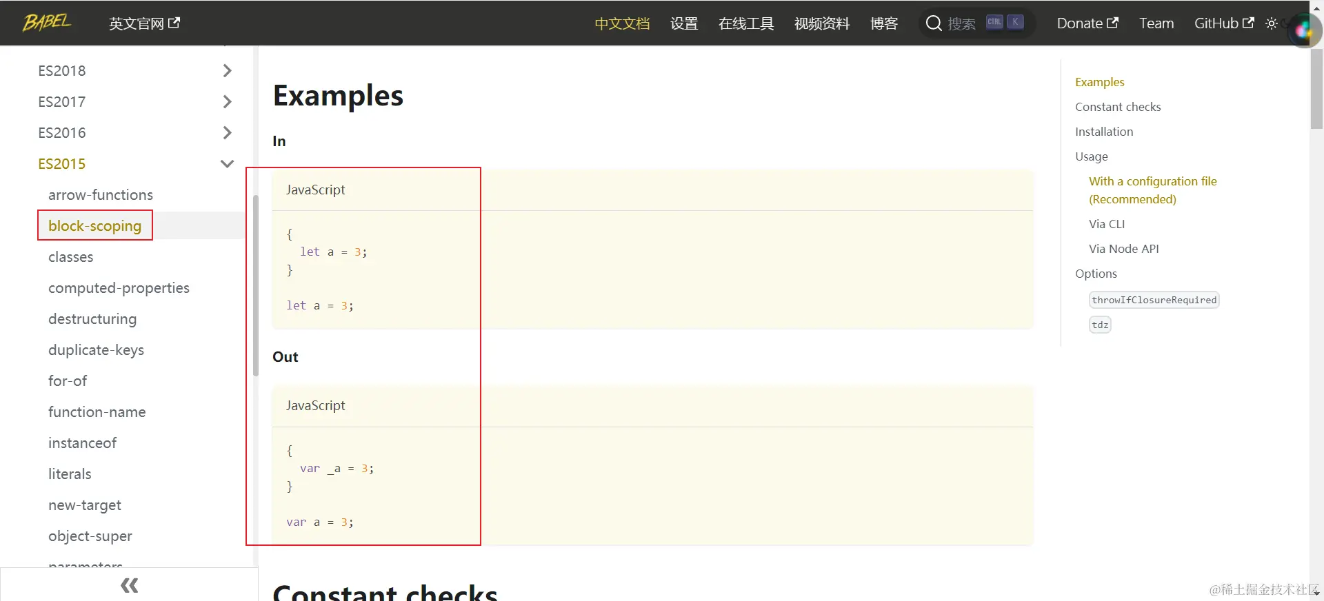 对应特定的语法转换,我们可以通过Babel提供的插件处理。在 Babel官网 中可以找到 const语法 对应的插件为 @babel/plugin-transform-block-scoping
