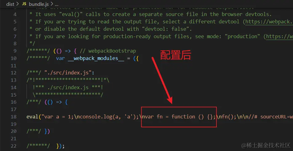 并在打包结果中,es6的代码未被转换: