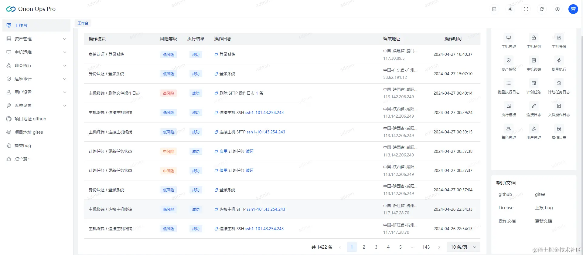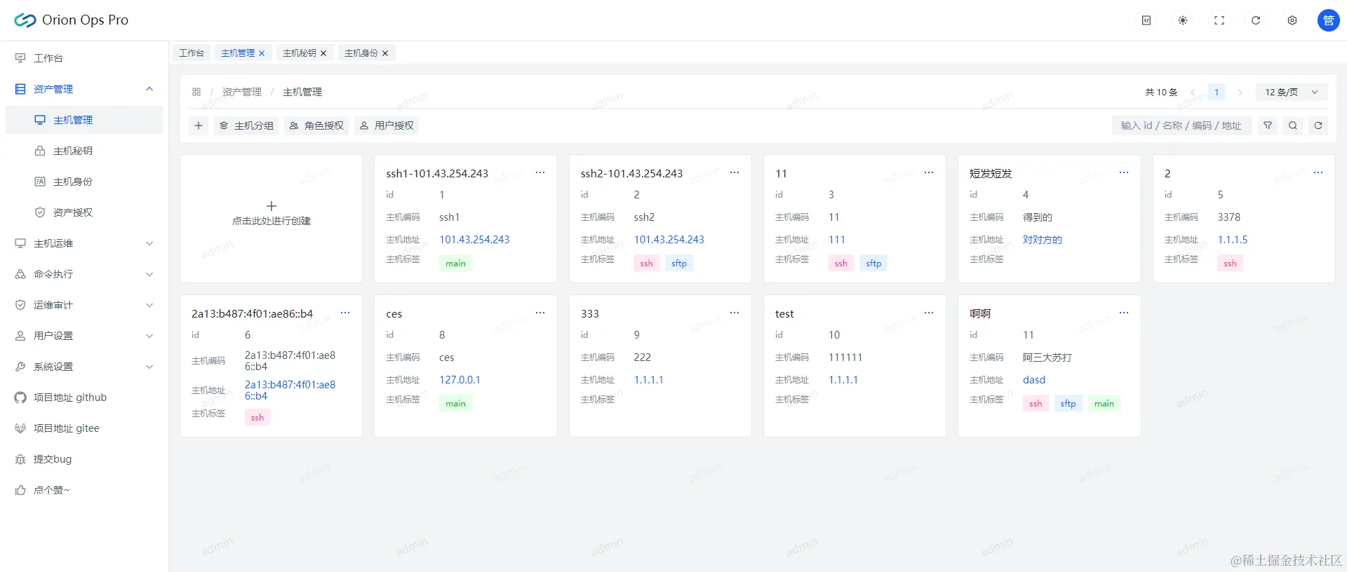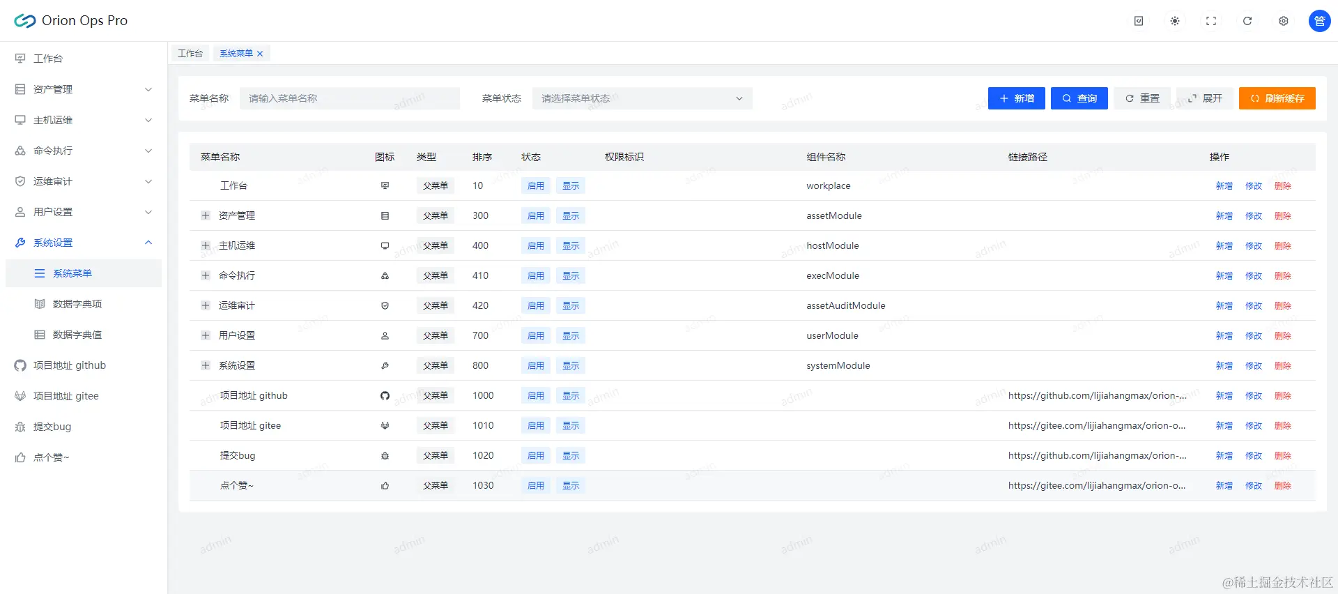 orion-ops-pro —— 一款现代化、高颜值的一站式智能运维管理平台,集资产管理、资产授权、批量执行、计划任务、WebShell、WebSftp、角色管理、系统管理等功能于一体,致力于简化运维团队的治理工作。