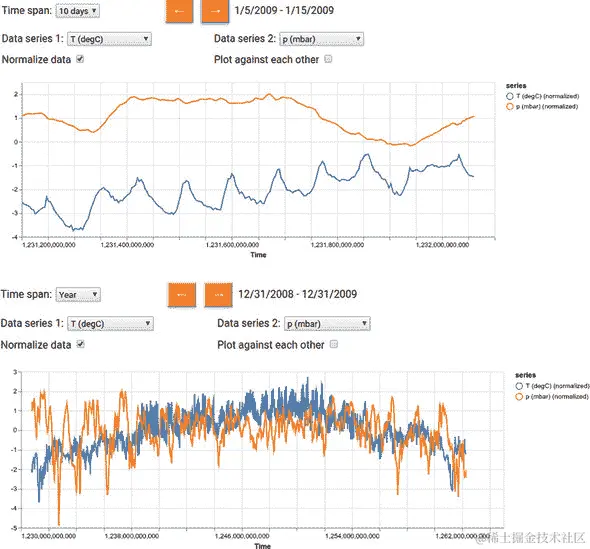 由清单 7.1 中的代码创建的折线图显示在图 7.1 的左侧面板中。这是一个只有四个数据点的简单曲线。但是,linechart()函数可以支持更多数据点的曲线(例如,数千个)。然而,如果你尝试一次绘制太多数据点,你最终会遇到浏览器的资源限制。限制与浏览器和平台相关,应当通过实证方法来确定。一般来说,为了使用户界面流畅响应,限制图表中可呈现的数据大小是一个好习惯。