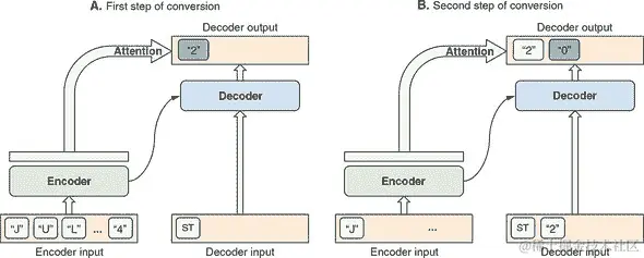 推理时,对模型的输出张量应用argMax()操作以获取获胜的输出字符。在转换的每一步中,获胜的输出字符都会附加到解码器的输入中,因此下一转换步骤可以使用它(参见图 9.11 右端的箭头)。正如我们之前提到的,这个迭代过程最终产生整个输出序列。