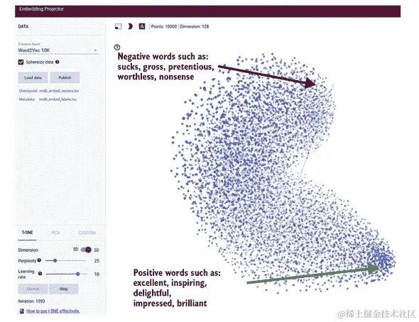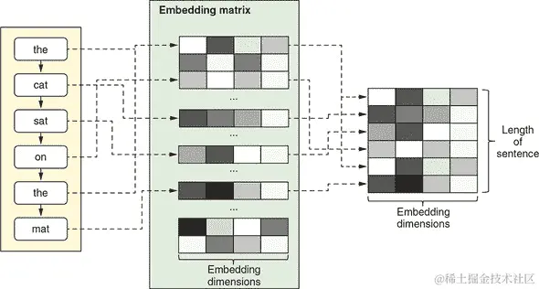 在词嵌入中,每个单词被表示为一个稀疏向量,其中元素值通过反向传播学习,就像神经网络的所有其他权重参数一样。在 TensorFlow.js 中执行嵌入的函数是