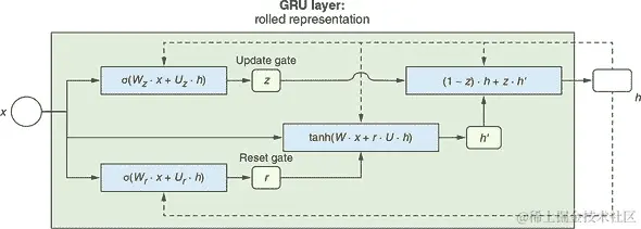LSTM 是一种我们尚未详细介绍的 RNN 类型。我们不会在这里讨论其内部结构。简而言之,它类似于 GRU(图 9.4), 通过使得在多个时间步中传递状态变得更容易来解决梯度消失的问题。Chris Olah 的博文“理解 LSTM 网络”,在本章末尾提供了指针在 “进一步阅读资料” 中,对 LSTM 结构和机制进行了出色的评述和可视化。我们的编码器 LSTM 应用在字符嵌入向量上: