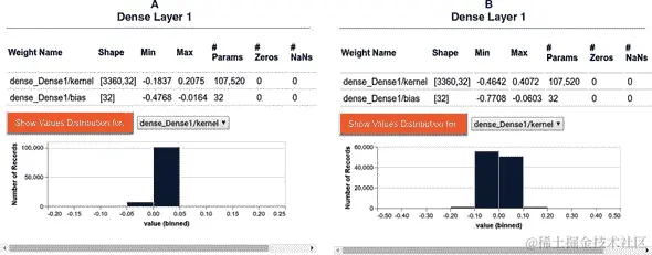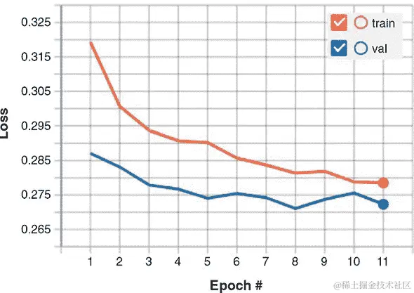 由清单 7.2 创建的图表显示在图 7.1 的右侧面板中。如您在本书的电子版本中图表中所见,tfjs-vis 选择两种不同的颜色(蓝色和橙色)来渲染两条曲线。这种默认的着色方案通常很有效,因为蓝色和橙色很容易区分。如果有更多的系列需要呈现,其他新颜色将自动选择。