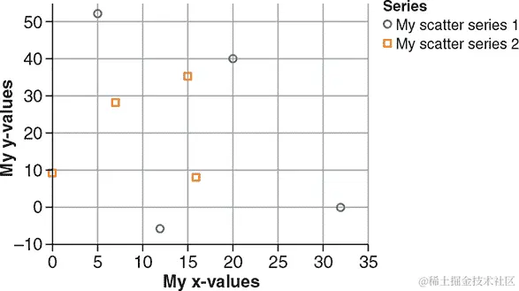 图 7.2. 包含两个系列的散点图,使用 清单 7.3 中的代码制作。