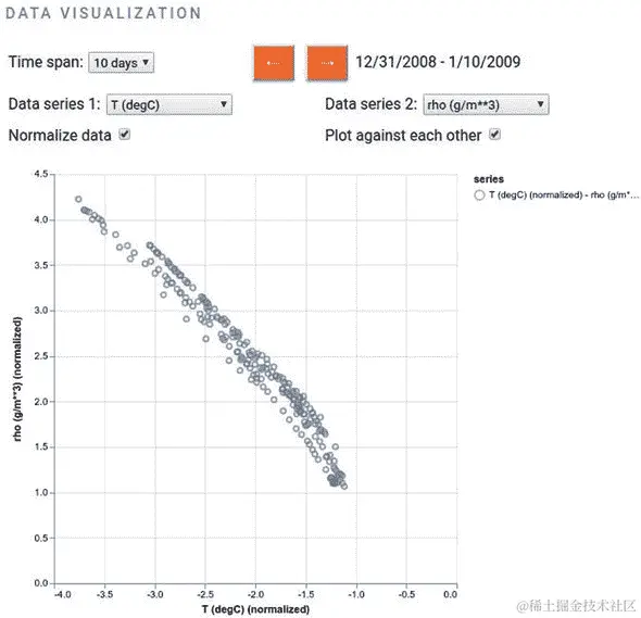 在 tfvis.render 中,让您创建散点图的函数是 scatterplot()。正如 清单 7.3 中的示例所示,scatterplot() 可以呈现多个系列,就像 linechart() 一样。事实上,scatterplot() 和 linechart() 的 API 实际上是相同的,您可以通过比较 清单 7.2 和 清单 7.3 来了解。清单 7.3 创建的散点图显示在 图 7.2 中。