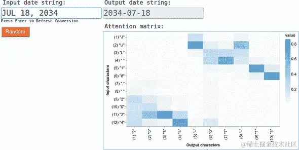 在 seq2seq 问题中,注意机制使得输出序列的不同项能够选择性地依赖于输入序列的特定元素。我们演示了如何训练基于注意力的编码器-解码器网络来解决简单的日期转换问题,并在推断过程中可视化注意力矩阵。