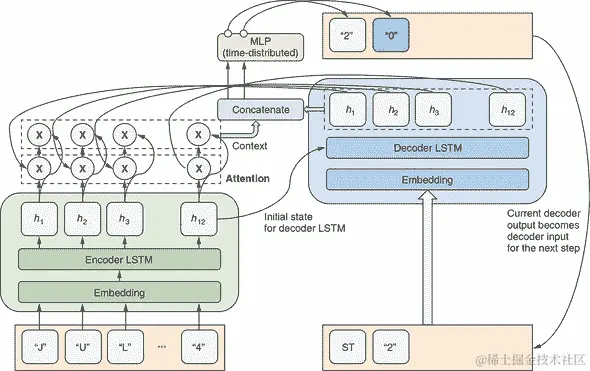 它简单地沿着时间维度(第二维度)切片时间序列张量并输出最后一个时间步。这使我们能够将编码器 LSTM 的最终状态发送到解码器 LSTM 作为其初始状态。这种连接是解码器获取有关输入序列信息的方式之一。这在 图 9.11 中用将绿色编码器块中的 h[12] 与蓝色解码器块中的解码器 LSTM 层连接的箭头进行了说明。