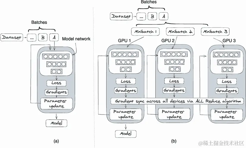 图 4.1 同步数据并行概念图。(a)在单 GPU 上进行深度学习训练。(b)使用三个 GPU 进行同步数据并行训练。