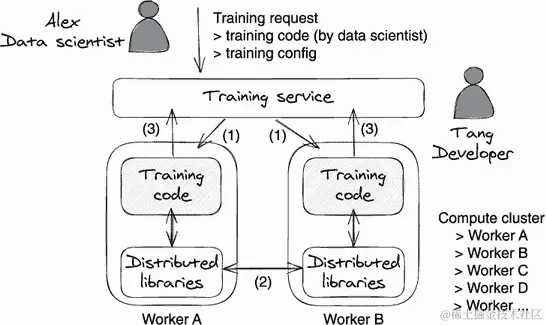在本章中,我们将从软件工程师的角度探讨如何支持分布式训练。具体来说,我们将看到如何编写一个训练服务来在一组机器上执行不同的分布式训练代码(由数据科学家开发)。