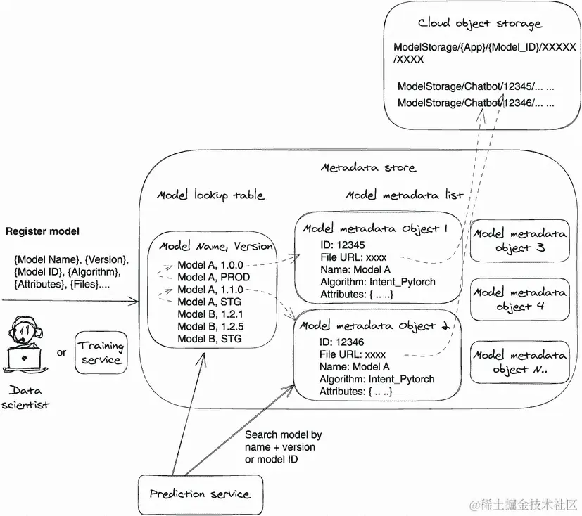 当元数据存储接收到模型注册请求时,首先,它为此模型创建一个元数据对象。其次,通过添加一个新的搜索记录来更新模型查找表;该记录使我们能够通过使用模型名称和版本来找到该模型元数据对象。除了通过使用模型名称和版本搜索查找表外,元数据存储还允许通过使用模型 ID 进行模型元数据搜索。