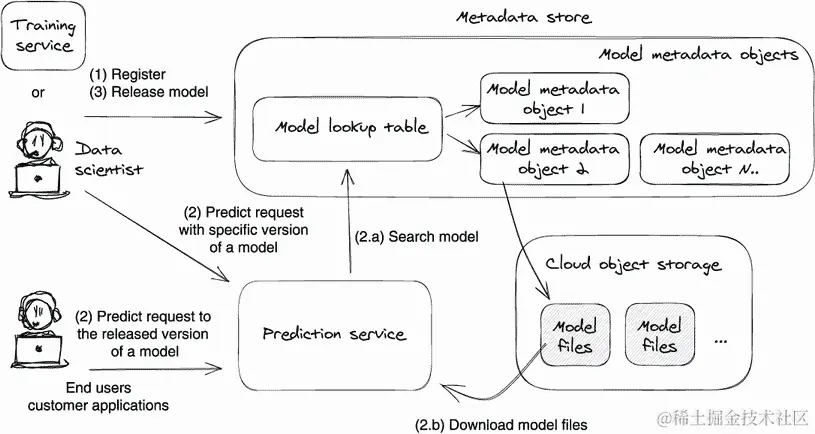 图 7.12 模型发布流程工作流程:(1)在模型元数据存储中注册模型;(2)加载模型的任意版本以提供预测请求;以及(3)在元数据存储中发布模型
