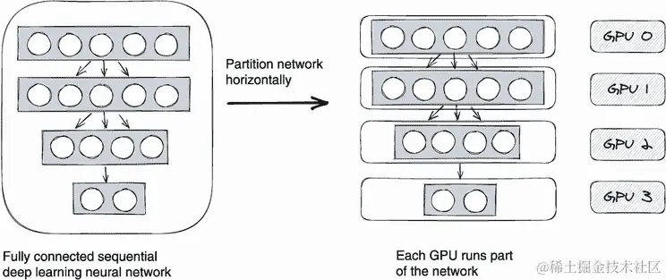 尽管数据并行化有很多优点,模型并行化和流水线并行化也各自具有自己的优势和用途。例如,当您有无法适应一个 GPU 的大型模型时,它们是最佳的分布式解决方案。我们将在第 4.4 节中更详细地讨论它们。