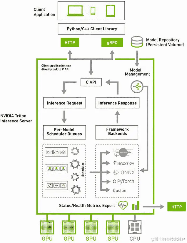在撰写本书时,我们认为 Triton 是最佳的模型服务方法,原因有三。首先,Triton 不依赖任何训练框架;它提供了一个设计良好且可扩展的后端框架,使得它能够执行几乎任何训练框架构建的模型。其次,Triton 提供了更好的模型服务性能,例如服务吞吐量。Triton 有多种机制来提高其服务性能,例如动态批处理、GPU 优化和模型分析工具。第三,Triton 支持高级的模型服务用例,如模型集成和音频流式传输。