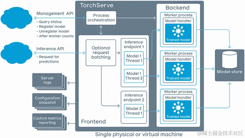 TorchServe、TensorFlow Serving 和 Triton 都是可靠的开源模型服务工具,它们都采用了模型服务器方法。如果适用,我们推荐 Triton,因为它与大多数模型训练框架兼容,并且在 GPU 加速方面具有性能优势。