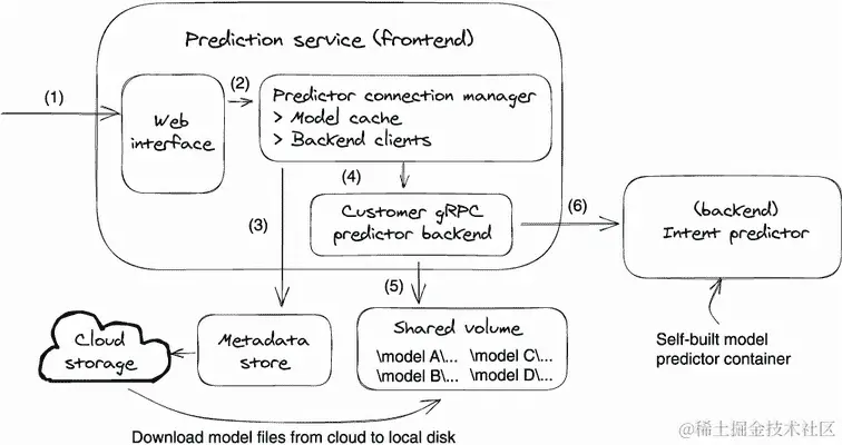 图 7.14 显示了预测服务实时加载指定的服务请求中的模型。在接收到预测请求时,路由层首先在元数据存储中找到请求的模型,下载模型文件,然后将请求传递给后端预测器。以下是运行时模型加载和服务过程的七个步骤的详细说明: