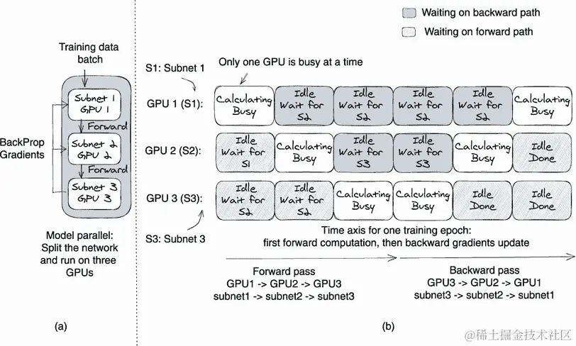 通过比较图(a)和(b),您会发现与单设备训练相比,同步数据并行引入了两个额外步骤。第一个额外步骤是将一个训练批次分成三个小批次,这样每个设备就可以处理自己的小批次。第二步是同步来自所有机器的聚合梯度,以便它们在更新本地模型时都使用相同的梯度。