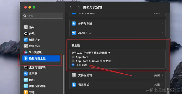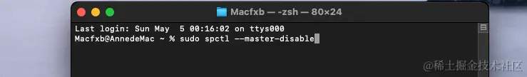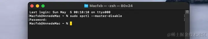 无法打开“XXXX”,因为Apple无法检查其是否包含恶意软件。怎么解决? Mac分享吧 2024-05-05 265 阅读1分钟 新入手的苹果电脑打开软件出现:无法打开“XXXX”,因为Apple无法检查其是否包含恶意软件。怎么解决? 1. 点击菜单栏搜索图标,输入:终端 ,点击打开,如下图: 2. 输入以下命令,如下图: sudo spctl --master-disable 3. 回车!输入密码(密码输入过程是不显示的),如下图: 4. 输入密码回车后,如下图:(如果密码输入错误会提示:Sorry, try again. 请重新输入;) 此代码为打开:系统偏好设置 – 隐私与安全性,中的【任何来源】,如下图: