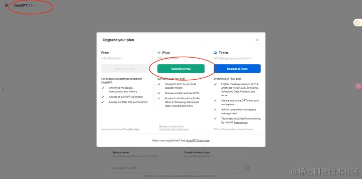 得到付款信息之后,我们再打开GPT官网,登录GPT账号后,选择左上角升级至plus,再选中间绿色的个人版,跳转到升级界面