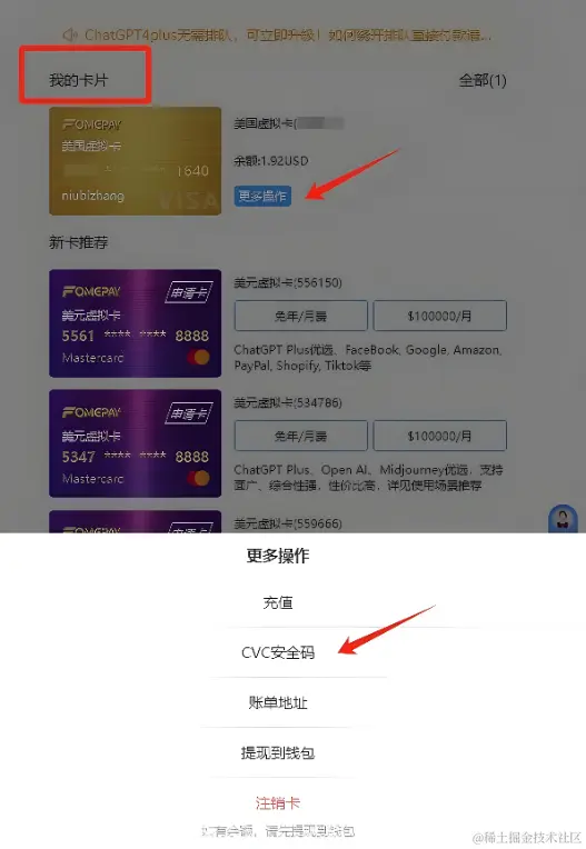 4.开完卡后再 卡中心---CVC卡密 里面可以得到卡的付款信息
