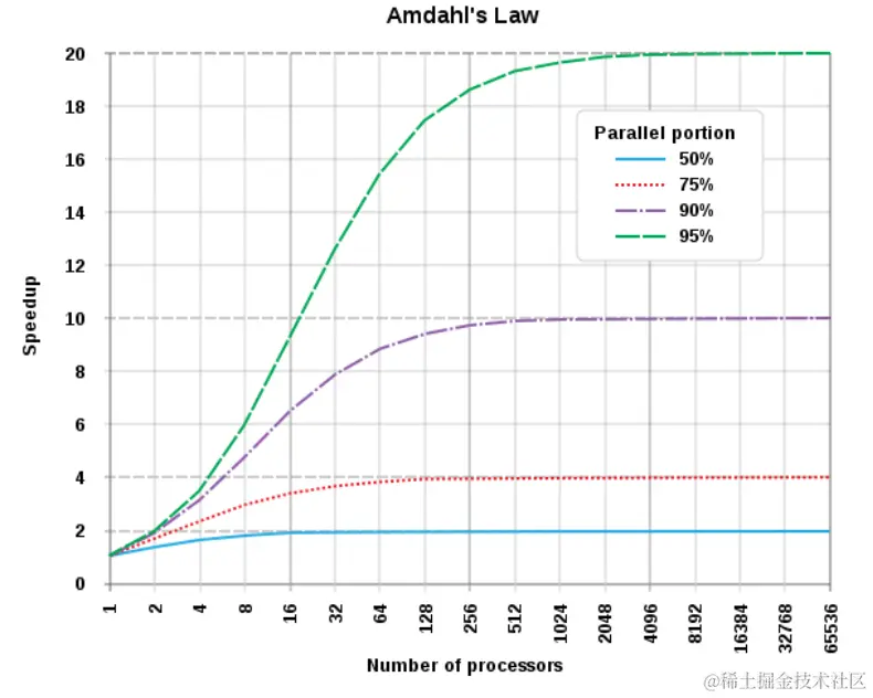 这就是 Amdahl 定律的作用,它描述的是:在增加计算资源的情况下,程序在理论上能够实现的最高加速比。