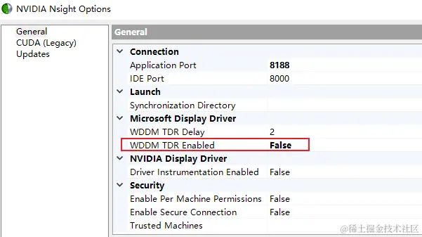 在安装CUDA工具的时候携带的Nsight Monitor工具,以管理员的方式打开,然后设置TRD为false。