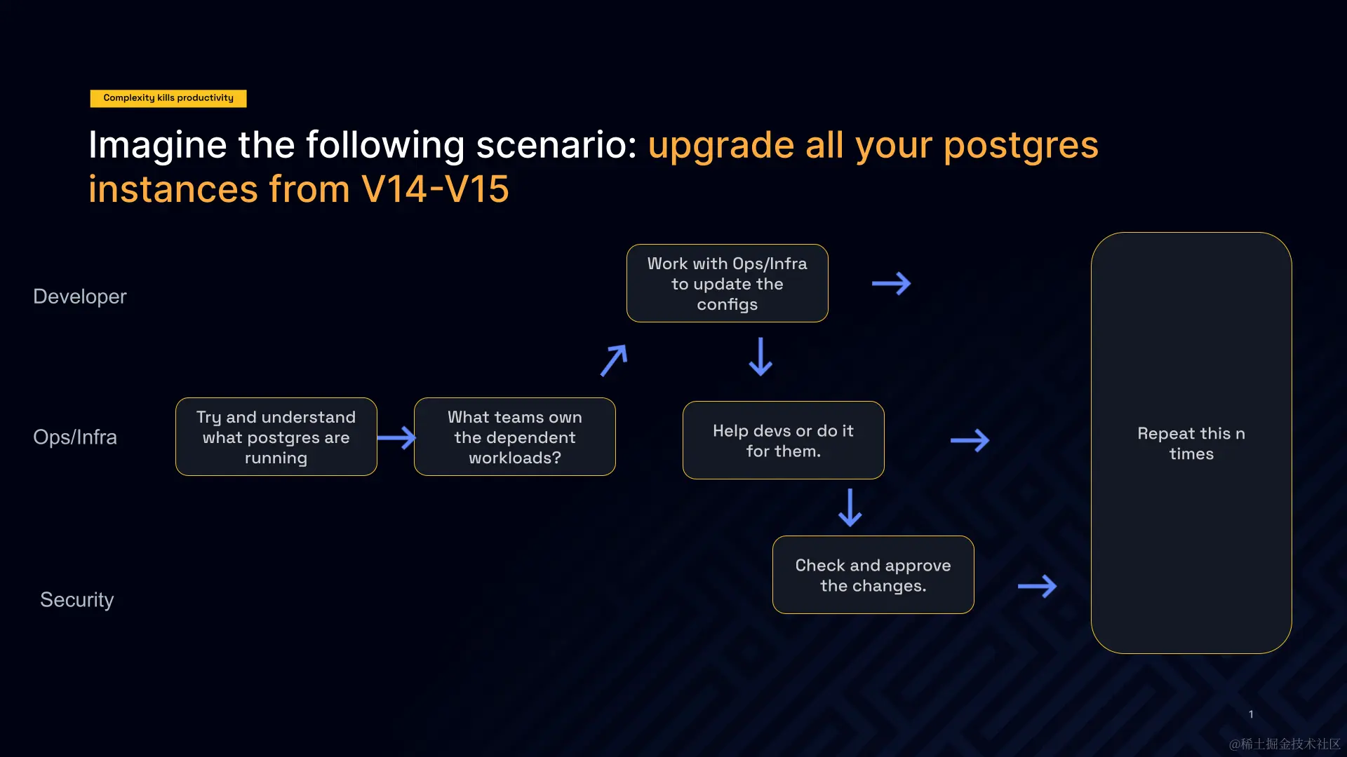 例如,假设您需要将 Postgres 从 Vx 升级到 Vx+1,并且您需要在所有应用程序开发团队中执行此操作。如果没有 IDP,您必须转到每个团队,找出他们正在运行哪个实例,然后将其全部映射出来。然后,您必须返回并进行升级,通常与各个团队一起,每个实例都是唯一的。