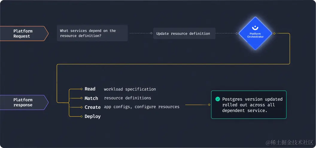 使用构建良好的 IDP(平台编排器作为后端),您可以简单地更新一个文件(资源定义),下次任何团队部署其工作负载时,将自动使用较新的资源版本。