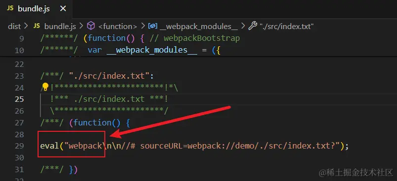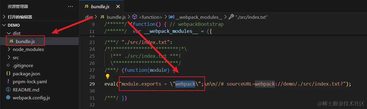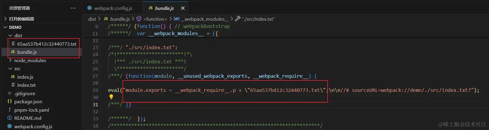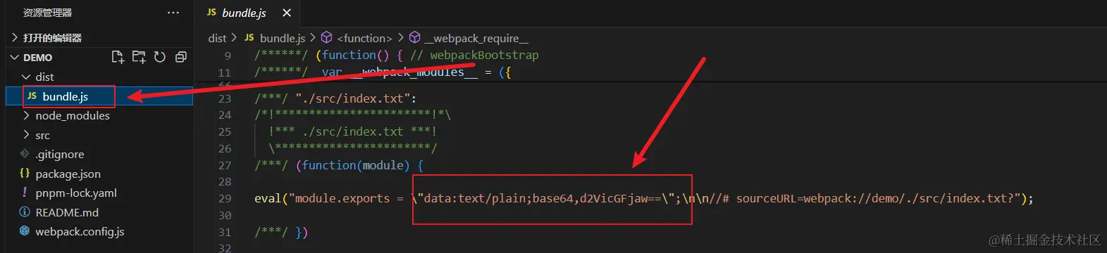 我们看到在src目录下新建了一个txt文件,并且在入口文件index.js中引入了txt文件。默认情况下,运行pnpm dev命令打包后,发现 index.txt文件内容会作为字符串嵌入到输出的bundle.js中。
