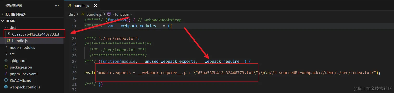 显式配置为asset/source后,会把txt当做一个模块,使用module.exports导出文本内容,供其他模块使用。