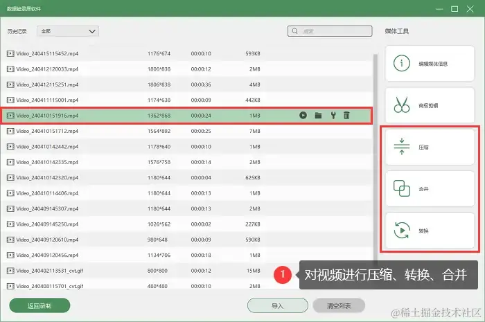 步骤4:在历史记录页面中,软件还提供了方便的多媒体处理功能,如压缩、合并、转换等,让你快速对视频进行操作。