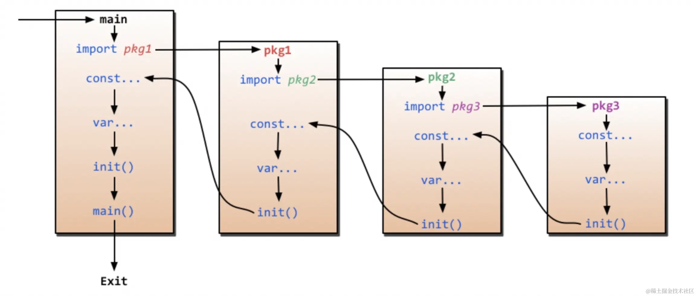 - 按顺序导入所有被 main 包引用的其他包,然后在每个包中执行如下流程。