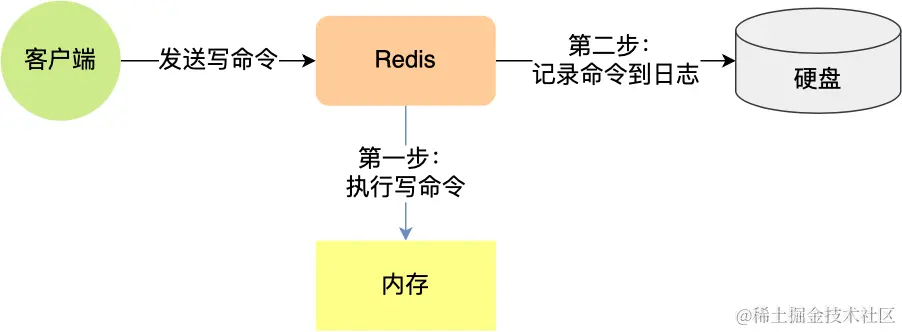 第一个风险,执行写操作命令和记录日志是两个过程,那当 Redis 在还没来得及将命令写入到硬盘时,服务器发生宕机了,这个数据就会有丢失的风险。