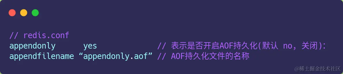 在 Redis 中 AOF 持久化功能默认是不开启的,需要我们修改 redis.conf 配置文件中的以下参数: