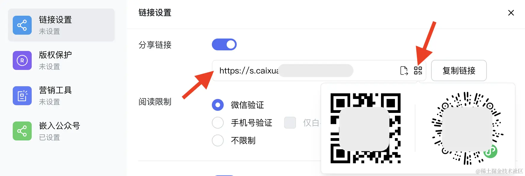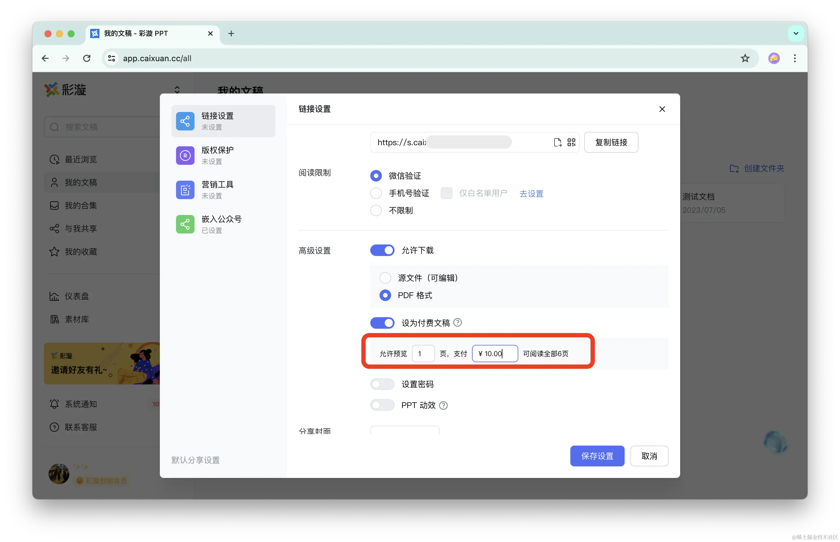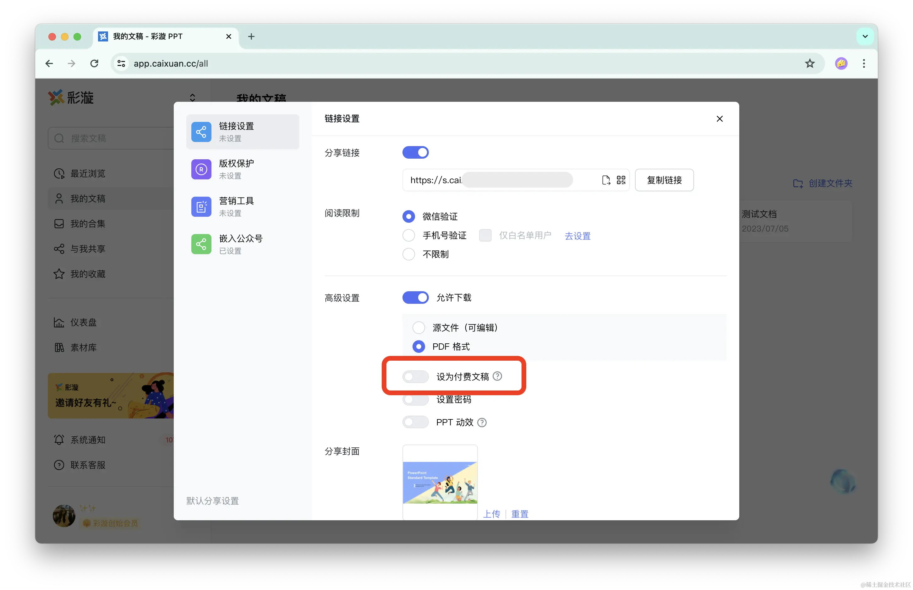 Step 2:进入「分享设置」-「链接设置」,开启「设为付费文稿」