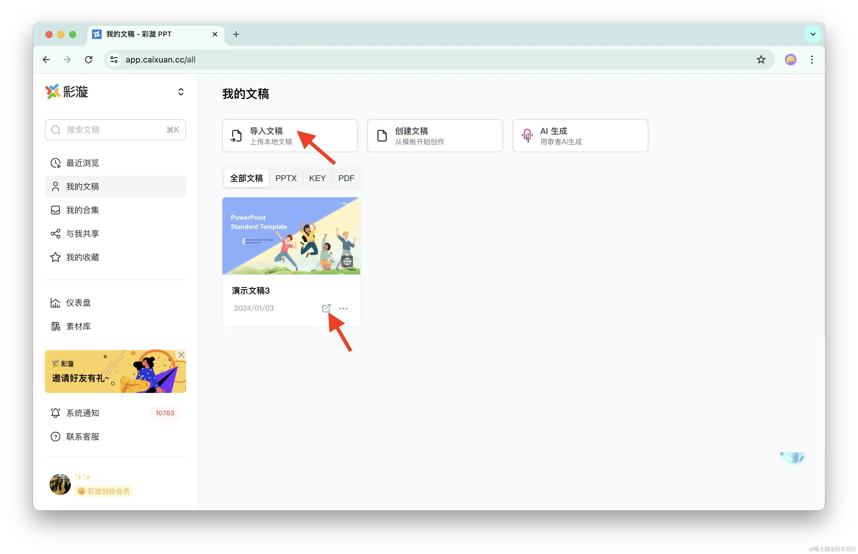 Step 1:登录彩漩 PPT,上传你想要分享的文档并「开启分享」
