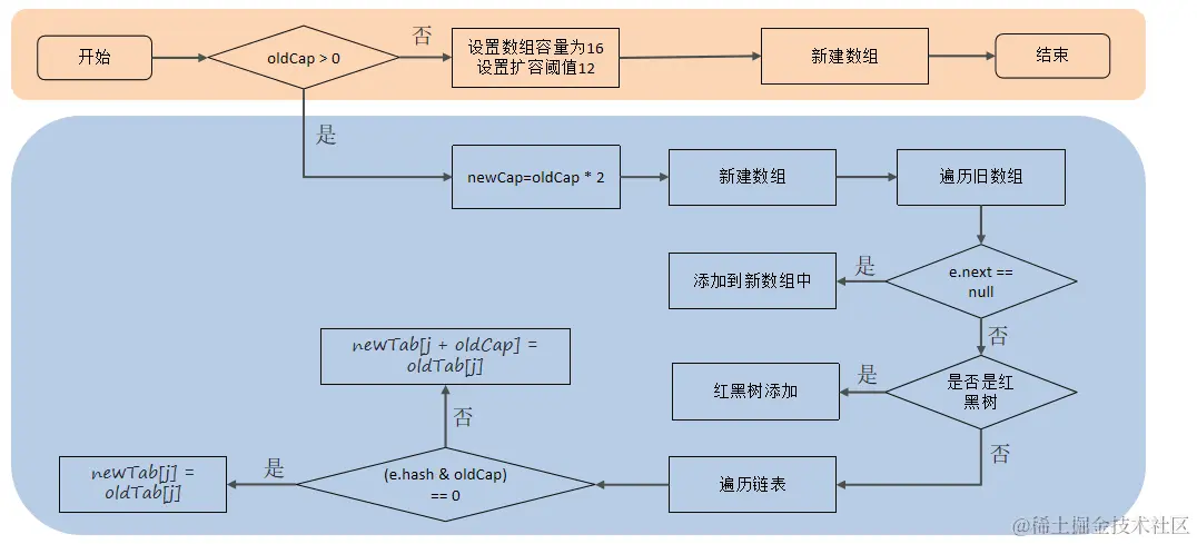 - 如果是链表,则需要遍历链表,可能需要拆分链表,判断(e.hash & oldCap)是否为0,该元素的位置要么停留在原始位置,要么移动到原始位置+增加的数组大小这个位置上