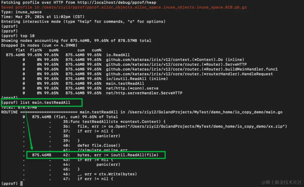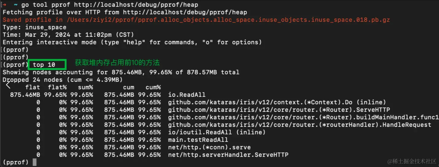 ①获取堆内存分配情况:go tool pprof http://xx/debug/pprof/heap