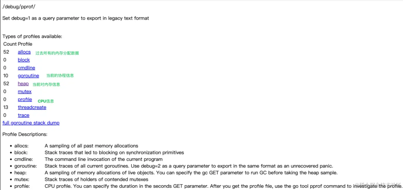 - goroutine: Stack traces of all current goroutines. Use debug=2 as a query parameter to export in the same format as an unrecovered panic.【当前所有运行的goroutine堆栈信息,实时变化】