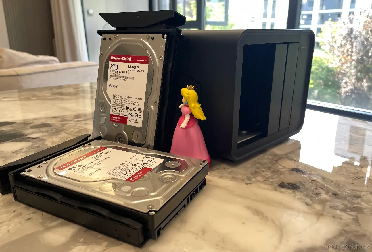 本次F4-424pro升级系统体验,使用的是西数红盘plus 8T硬盘两块,搭配TNAS的弹性磁盘阵列管理工具TRAID模式自动进行磁盘分配和管理。 这里不得不夸奖一句铁威马硬盘架的设计思路了,不同于大部分卡扣式设计,F4-424pro采用的是跷跷板式的按压拆卸方法,只要轻轻按压一下硬盘架上方,下方便会十分丝滑的弹出,从而实现轻松取出硬盘。