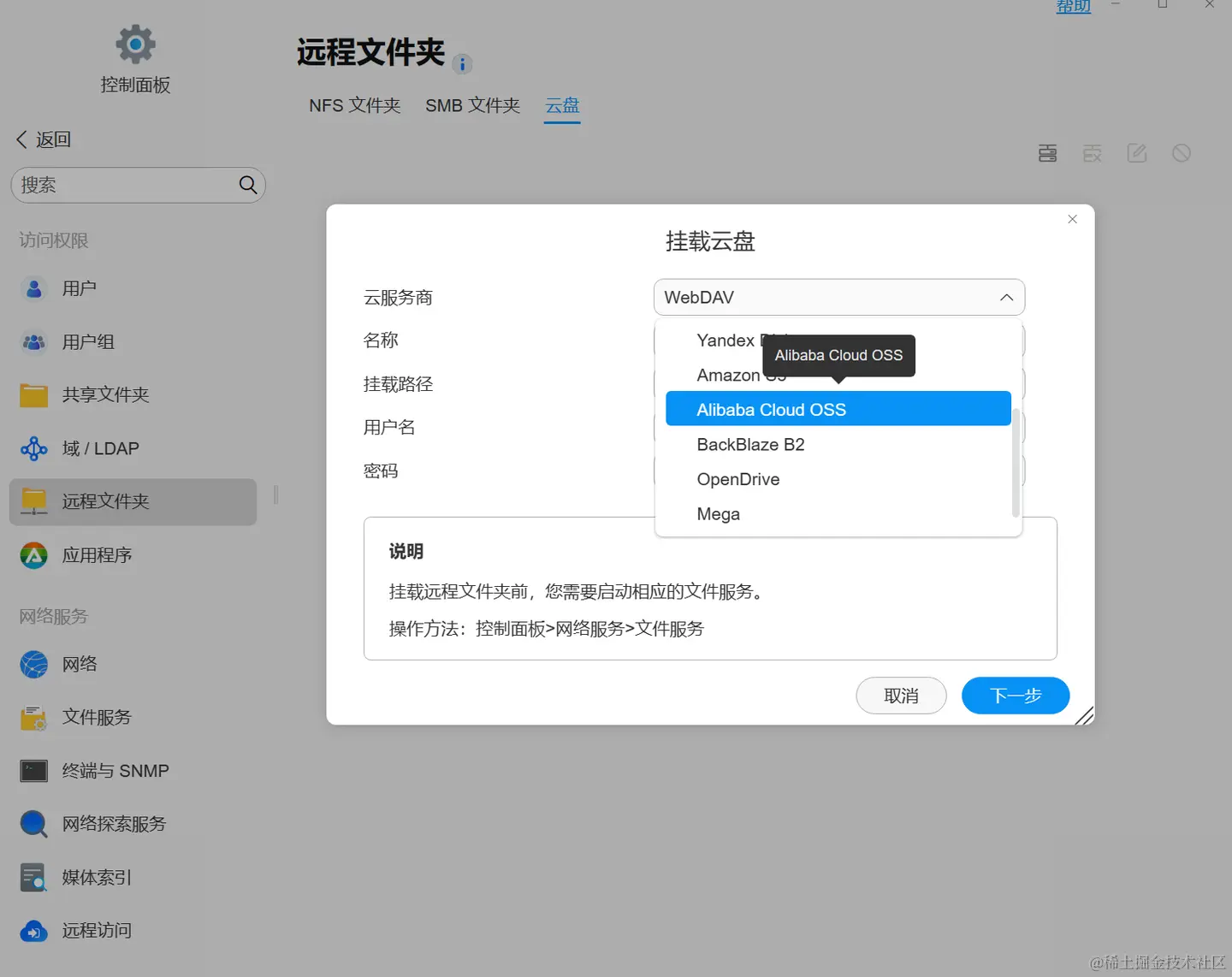 对于NAS用户来说,核心功能一直都是存储,在有限的盘位上,如何扩展更多的存储空间,也一直是NAS用户最关心的。 TOS 6以多途径聚合存储的模式,给出了这一答案,首先是推出了云盘挂载功能,支持BOX、OneDrive、DropBox、Google Drive、PCloud、Yandex Disk、Amazon S3、阿里云OSS、BackBlaze B2、OpenDrive、Mega等主流云盘挂载为本地目录,并实现自动同步;其次重磅更新Webdav挂载,使得以alist为支撑的更多网盘挂载成为可能;最后则是一贯以来的核心挂载服务,SMB及NFS。