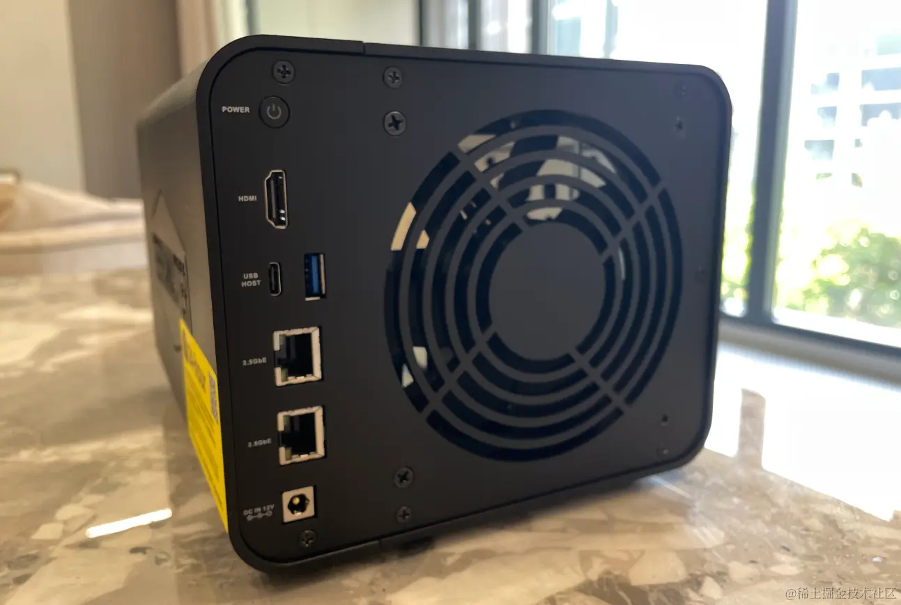 再看看背部的接口设计这块,F4-424pro提供的硬件接口还是十分能打的,从上往下分别是是HDMI接口,Type-C,USB3.2,双2.5G,DC电源等接口,可以轻松实现影视剧输出,实现链路聚合、SMB聚合等功能,支持UPS电源保护信号通道等。