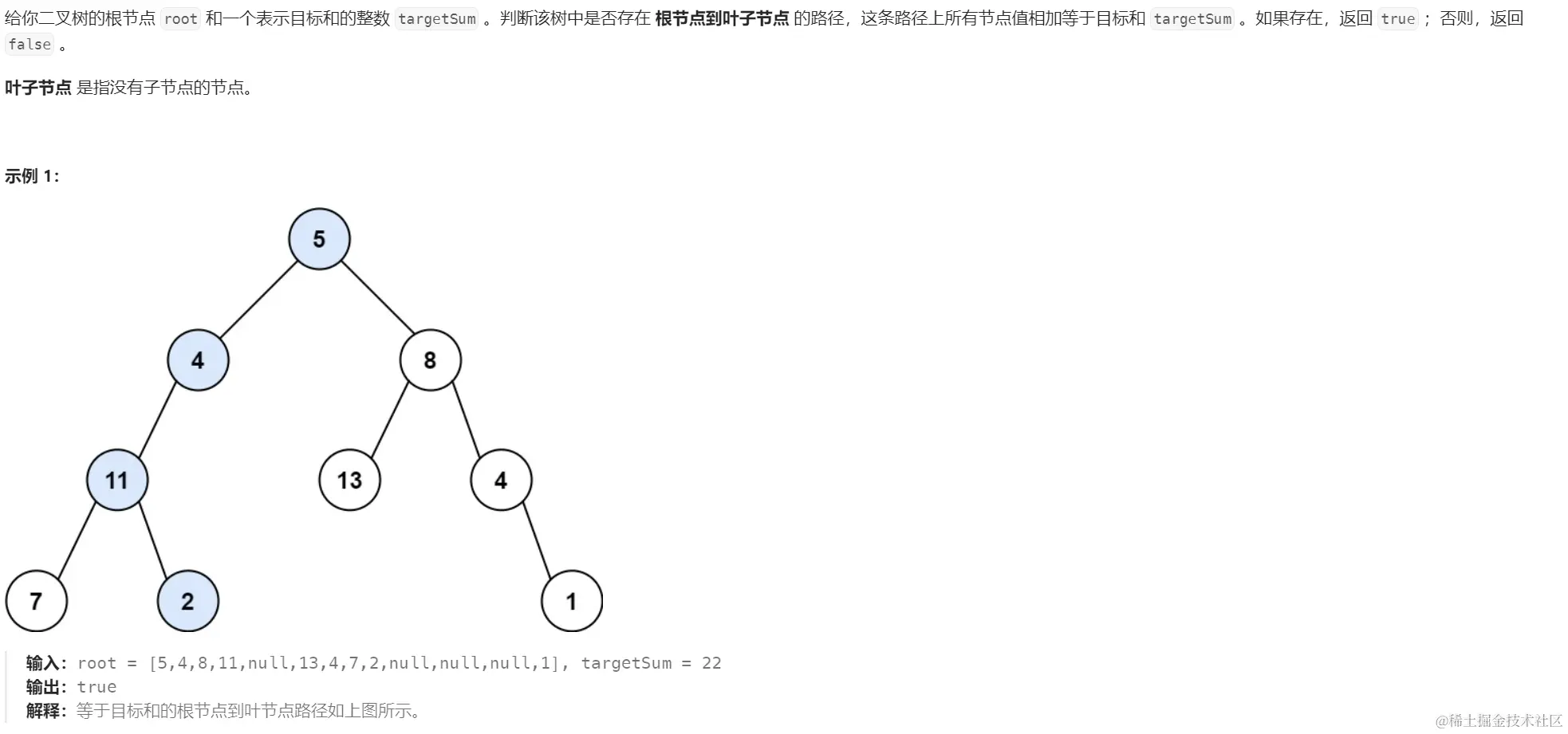 基于先序遍历进行处理即可,目标是将targetSum减到0同时满足当前为叶子节点。