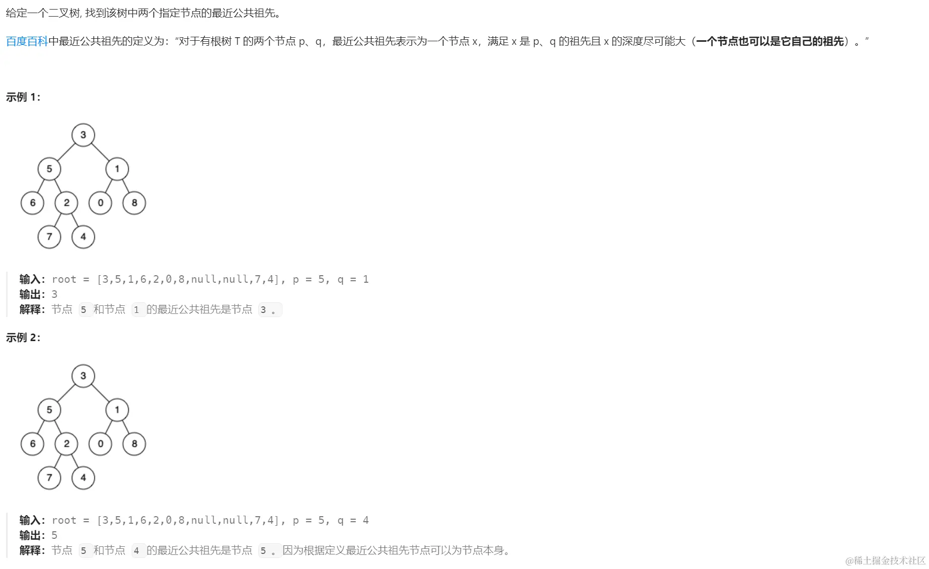 本题基于后序遍历进行处理,终止条件为当前节点为空,或者当前节点就是目标节点,所以如果左右子树都有返回值,则说明各自都找到目标节点,那最近公共祖先自然就是当前root节点。反之,如果左右子树都返回了空,则说明都没找到,那随便返回哪个都一样(因为无论哪个都是空)。另一类情况就是一个为空,一个不为空,言下之意就是,一个找到了目标值,一个未找到目标值,那自然得返回找到目标值的那一个,最后递归逻辑会带着其中一个返回的目标值,与另一个带着其中一个返回的目标值,命中左右子树都不为空的条件,即可返回root。