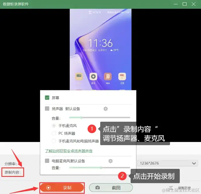 步骤4:可先点击 【录制内容】 对扬声器和麦克风进行调节,也可以按照默认模式。设置完成后,点击 【录制】 即可开始录制屏幕。