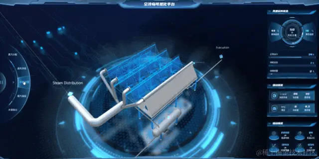 利用图扑软件自主研发的 HT for Web 强大的渲染引擎,数字孪生空冷岛内运作场景,无缝融合 2D、3D 可视化技术,对其展开立体化监控管理。整体场景多方位直观展示蒸汽分配、通风系统、冷凝过程、蒸汽凝结、冷凝排出等重点流程的运行态势。