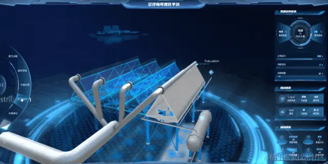图扑软件 HT 科幻风格以科技蓝为主色调,次要模型采用线框形式展现,方便透视查看内部要素。而内部重点设备则保留写实风格建模,使之在大场景中更加突出。