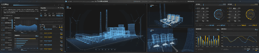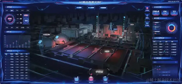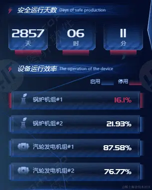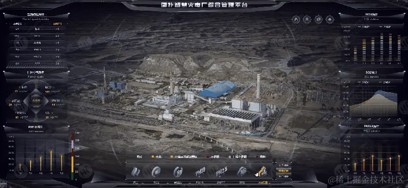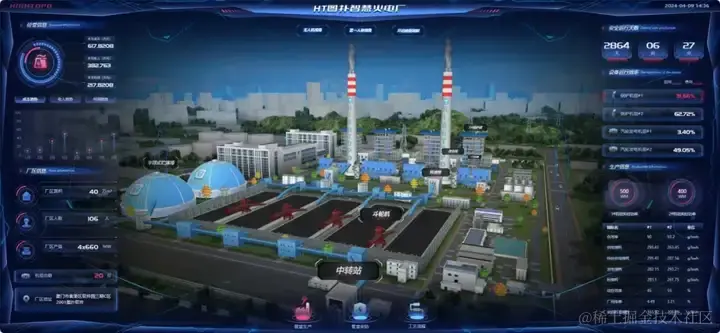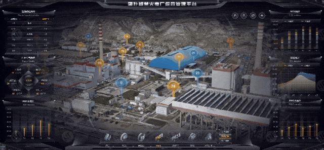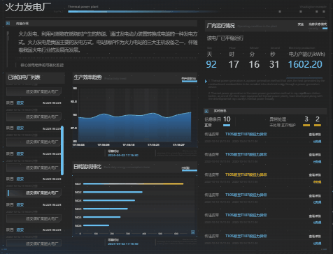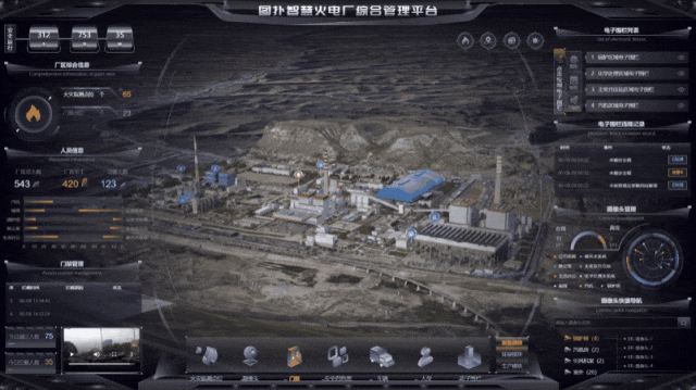本案例实际适配了现场超长屏幕,整个界面分为左、中、右三大板块,中央展示火电厂全局三维场景,两侧呈现电厂日常运维信息,旨在通过“一张图”形式呈现关键数据,实现电厂管理的目标。